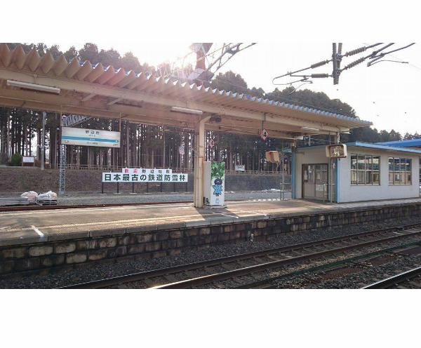 歴史を感じる一コマ。いかにもローカル鉄道、といった佇まいと、特有の鉄道保安林。